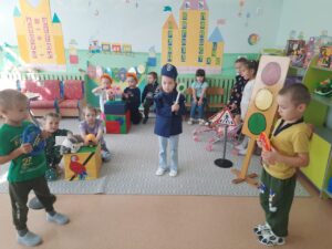 В детском саду состоялась встреча детей подготовительной группы с сотрудниками патрульно-постовой службы. Вместе с инспекторами дети вспомнили основные правила для пешеходов, правила поведения в автомобиле и общественном транспорте, закрепили знания о дорожных знаках и их назначениях. Вспомнили, для чего нужен светофор, какие бывают светофоры, какие сигналы светофор подает для пешехода. А ещё рассказали о необходимости использования светоотражающих элементов в тёмное время суток.